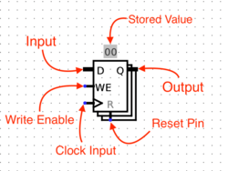 Registerfrom theMemorylibrary and place one register into your subcircuit. Below is an image illustrating the parts of a register.