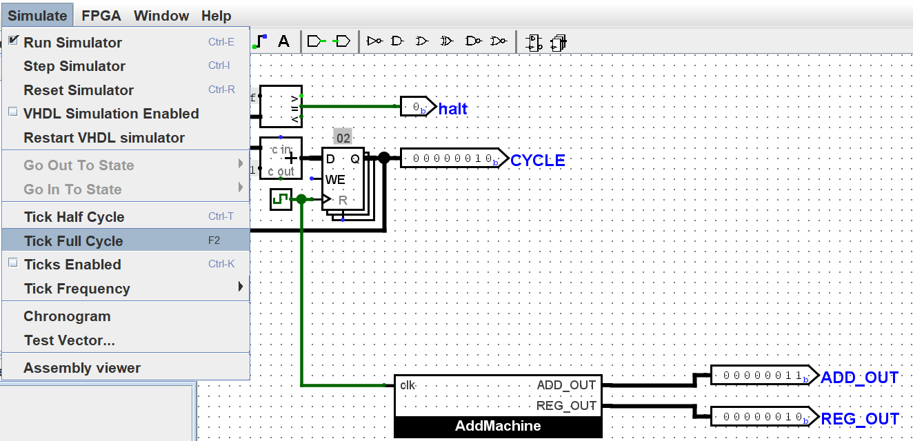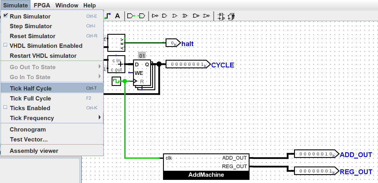 Simulate -> Tick Half Cycle(Command/Control + T). The outputs from yourAddMachineshould have gone up! Additionally, the clock should now be bright green.This is extremely important for project 3, so please make sure you know how to tick the clock and poke wires.
