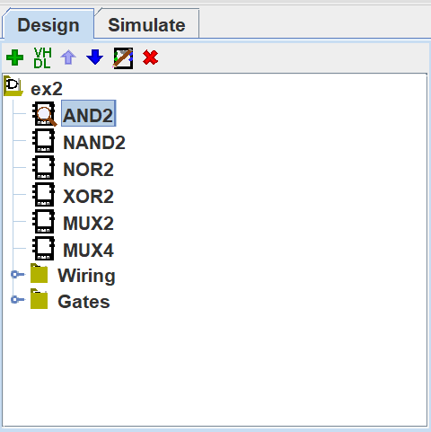 NAND2subcircuit. It's time to make your own circuit! Fill in this circuit without using the built-inNANDgate from the Gates library on the left (i.e. only use theAND,OR, andNOTgates; they're available as little icons in the toolbar at the top of the window, or in the Gates library in the circuit selector). When you're done, similarly fill in theNOR2,XOR2,MUX2(2-to-1 MUX), andMUX4(4-to-1 MUX). Please note thatNAND,NOR,XOR, andMUXalready exist in logisim. This exercise is meant to help you understand how to use subcircuits.- Please do not change the names of the subcircuits or create new ones, or your circuit may not work properly