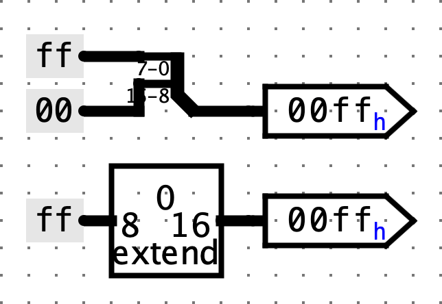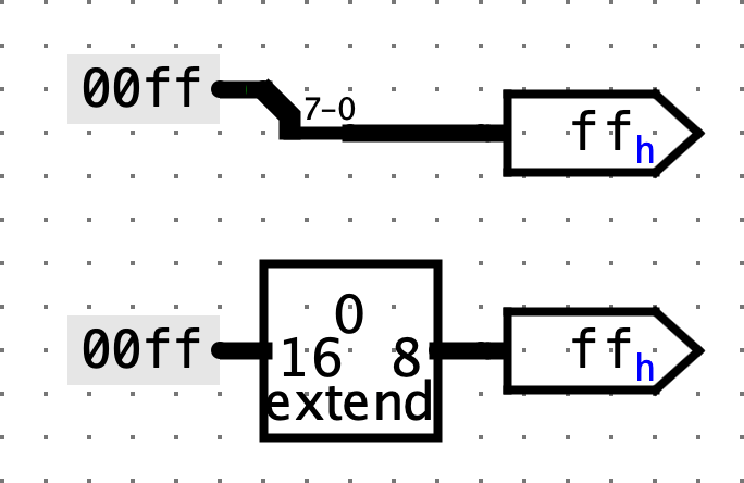 When changing the width of a wire, you should use a bit extender for clarity. For example, consider the following implementation of zero-extending an 8-bit wire into a 16-bit wire: