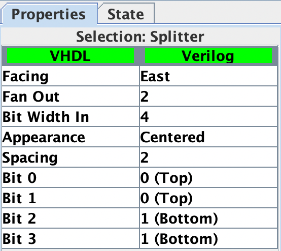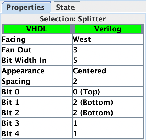 Click on a splitter (using the Select tool) to get its attributes in the sidebar (lower left). You can configure attributes like the number of arms on your splitter and the bits present on each arm. For the circuit above, the left and right splitters' attributes looks like this: