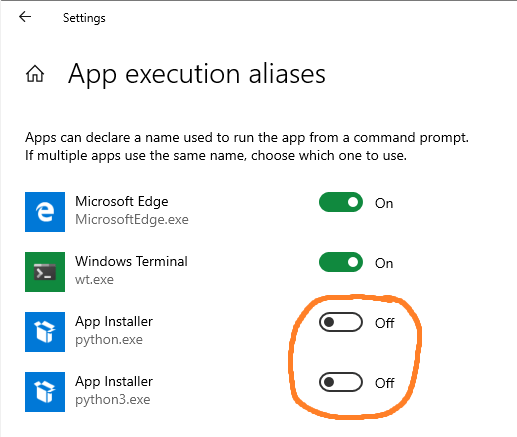 - Disable the store versions of Python by toggling the corresponding executables off.